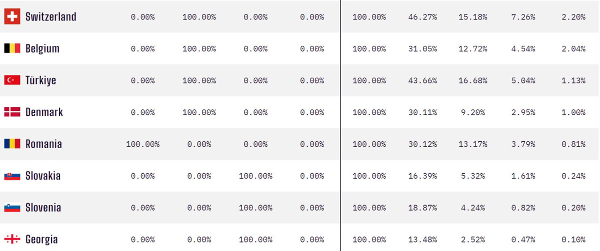 Найменше штучний інтелект вірить у тріумф дебютанта турніру збірної Грузії, яка сенсаційно вийшла в плей-оф після перемоги над Португалією. Шанс грузинів на виграш чемпіонату Європи складає 0,10%.