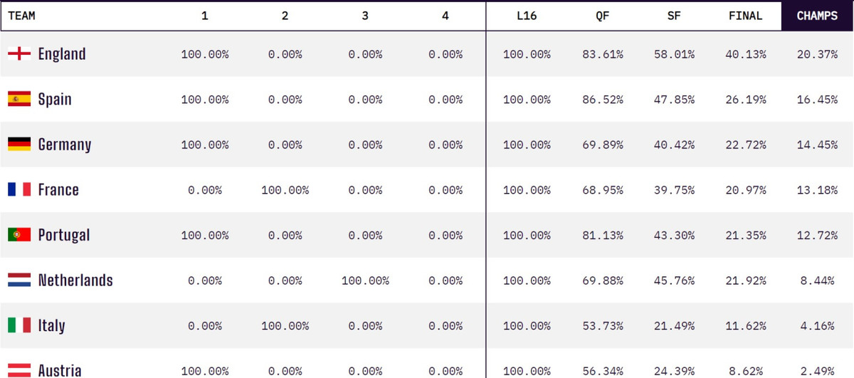 Відразу 4 команди з іншого боку сітки високо оцінюються штучним інтелектом. Так збірні Іспанії та Німеччини, які можуть зустрітися у чвертьфіналі, посідають 2 та 3 місце за рейтингом претендентів на завоювання трофея (16,45% та 14,45% відповідно).