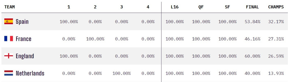 Другим потенційним претендентом на чемпіонство є суперник "Фурії Рохи" на стадії півфіналу — збірна Франції. "Півні", які здолали Португалію в серії пенальті, мають 27,31% шансу на перемогу в турнірі.