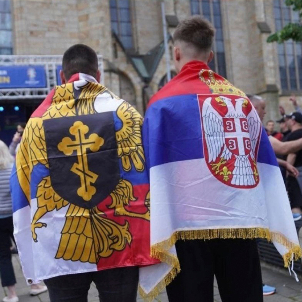 Ще перед грою на вулицях Гельзенкірхена були помічені фанати з прапором, який увібрав в себе російський і сербський та із зображенням православного хреста.