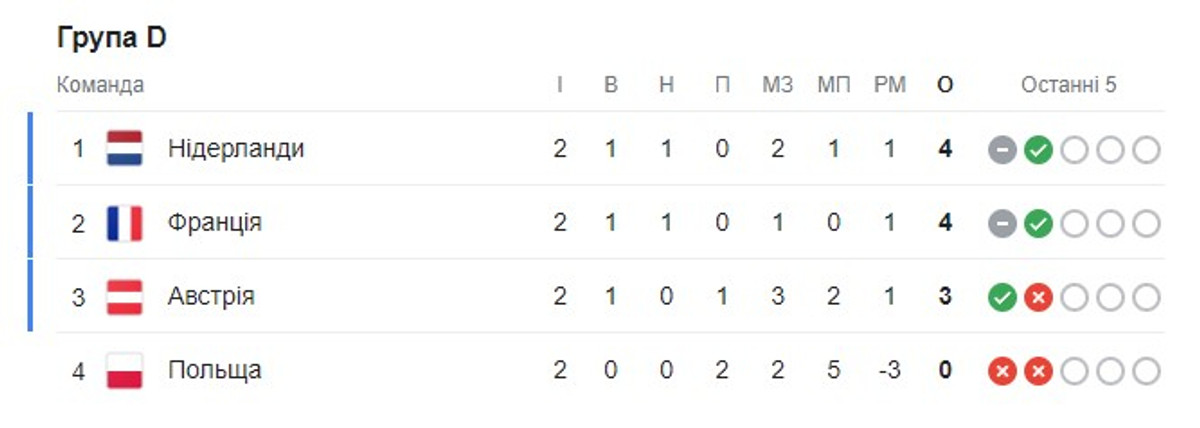 Збірна Нідерландів наразі лідирує в таблиці з 4 очками, Франція також має 4 бали, однак поступається за кількістю забитих голів, Австрія має три очки в активі, однак має перевагу над Польщею в особистих зустрічах.