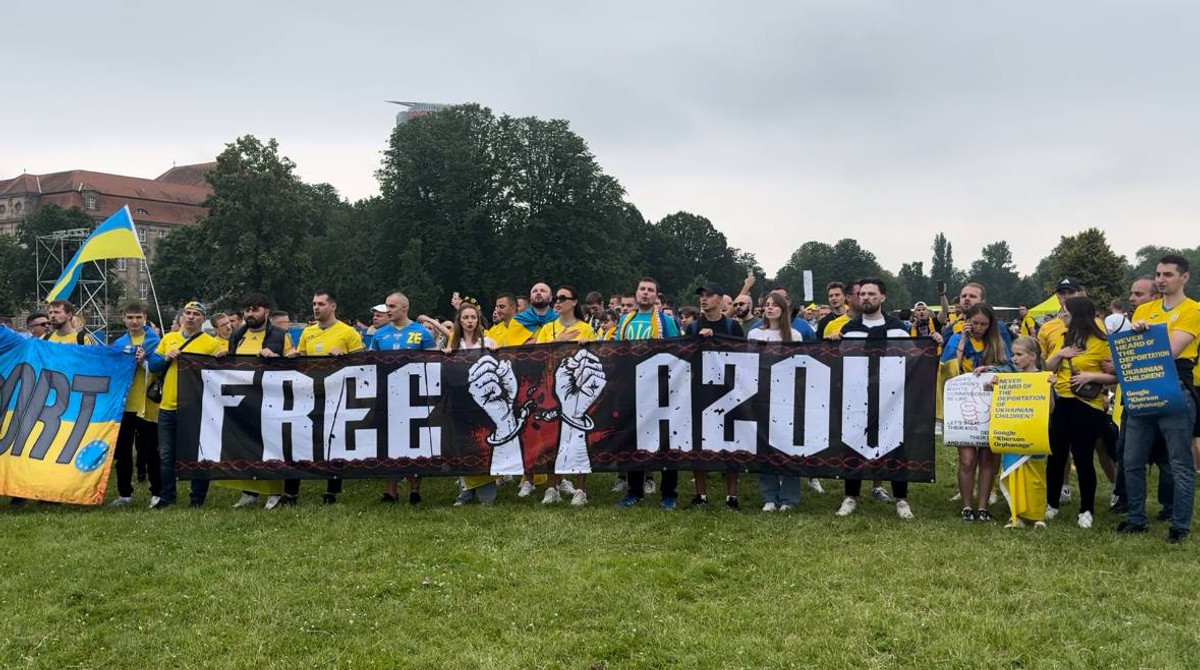 Після відбувся фан-марш, який простягався до стадіону. Тут українці також мали змогу нагадати світові про війну, можна було помітити плакат "Free Azov", "війна триває" і багато іншого.