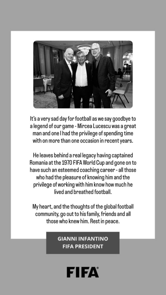"Це дуже сумний день для футболу – ми прощаємося з легендою нашої гри. Мірча Луческу був великою людиною, і мені пощастило не раз провести з ним час в останні роки.
