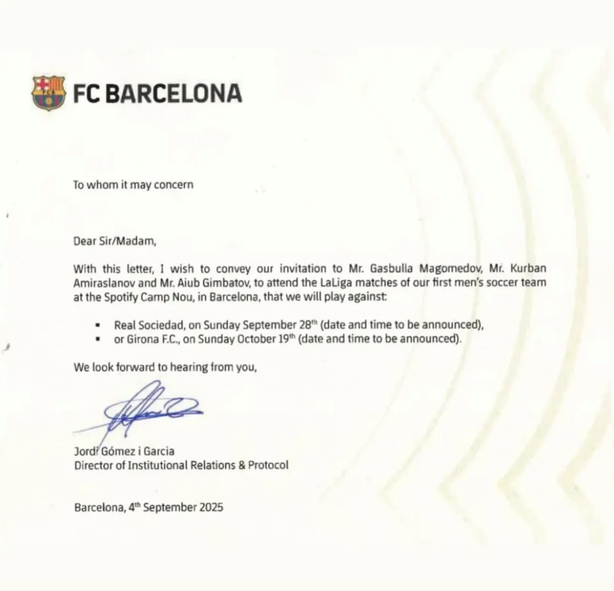 Каталонці надіслали запрошення одразу на два матчі – 28 вересня проти Реала Сосьєдад та 19 жовтня проти Жирони.