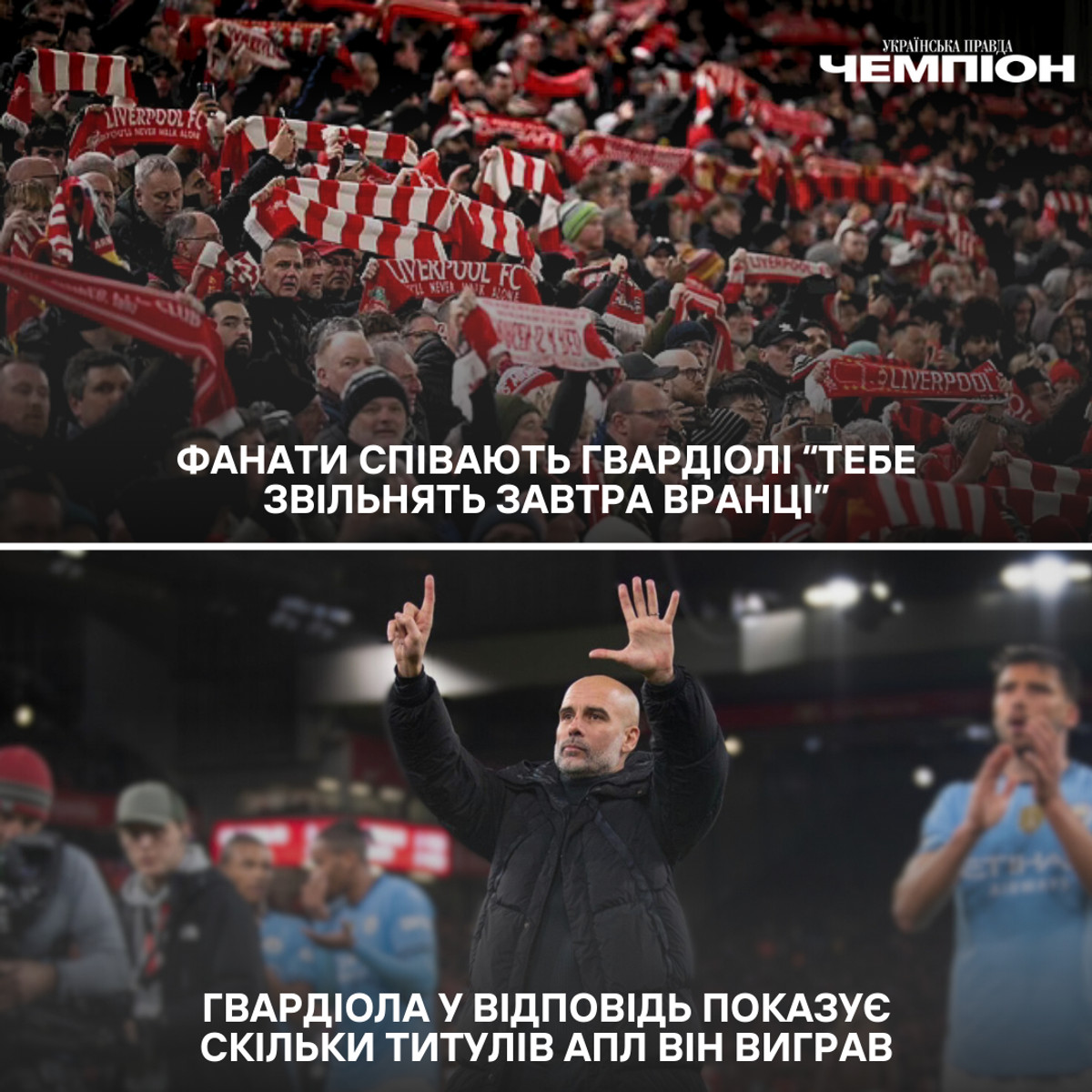 Фанати "червоних", розуміючи, що вони виграли цю гру, почали співати пісню про головного тренера "містян" Пепа Гвардіолу: "Завтра тебе звільнять".