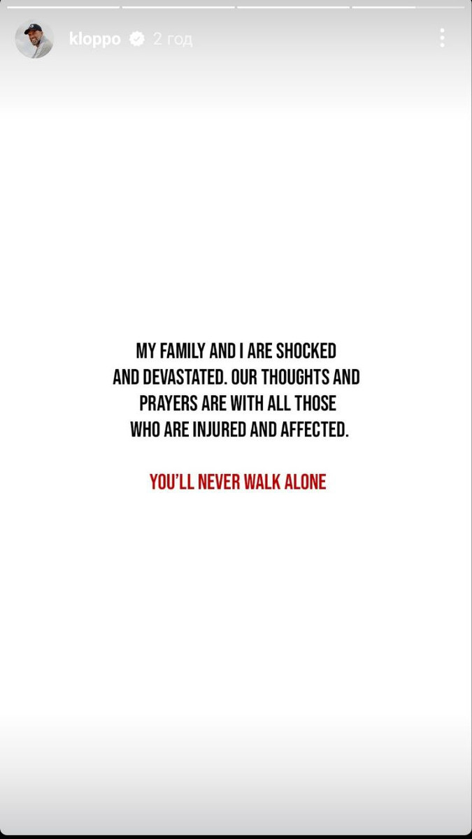 "Моя сім'я та я спустошені та шоковані. Наші думки та молитви разом з усіма постраждалими. Ти ніколи не будеш один ("You'll Never Walk Alone" – гімн Ліверпуля, – прим.)", – написав Клопп.