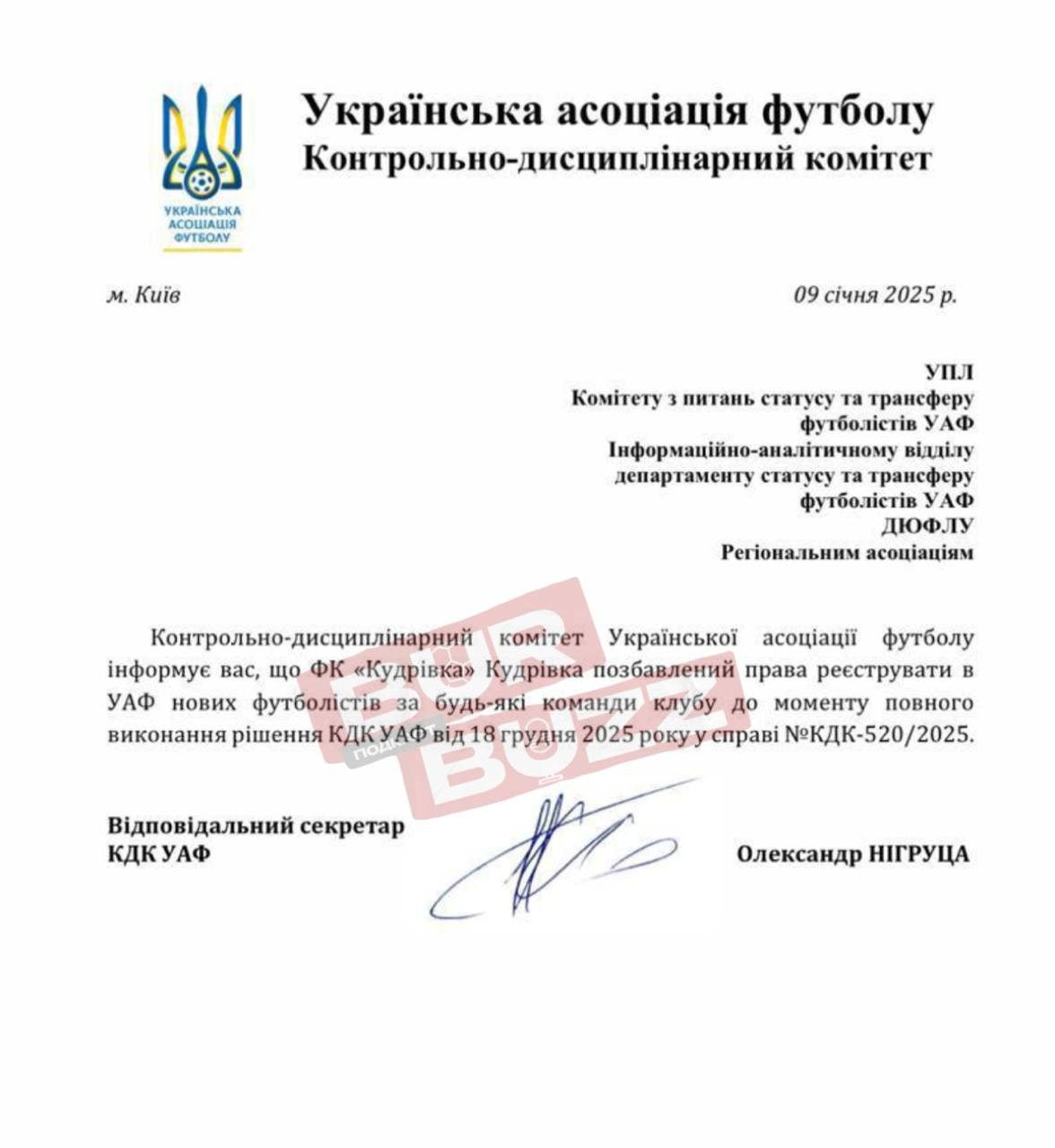 Кудрівка отримала заборону на трансфери від Української асоціації футболу.