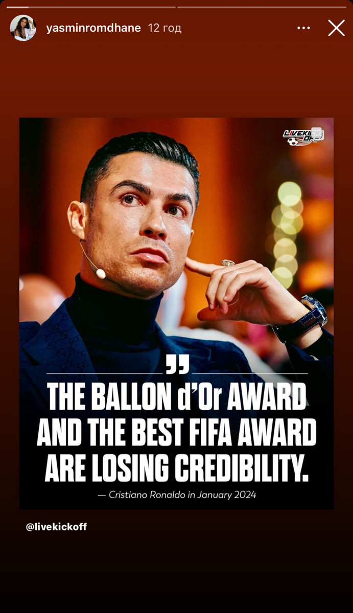 Ясмін Ромдхан зробила два дописи у соціальних мережах. У першому вона навела цитату Кріштіану Роналду про те, що нагорода втратила свою довіру, а потім залишила послання для самого Вінісіуса.