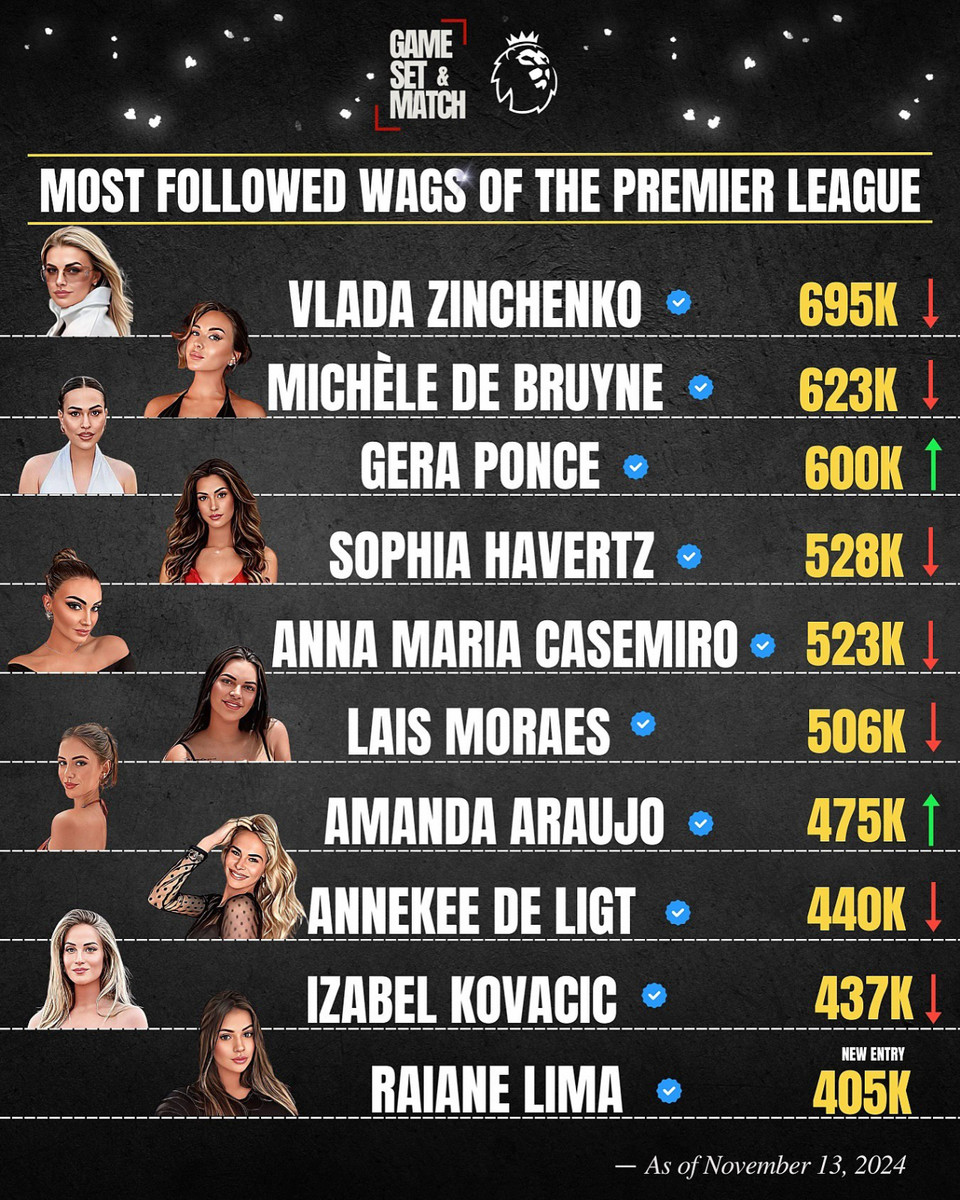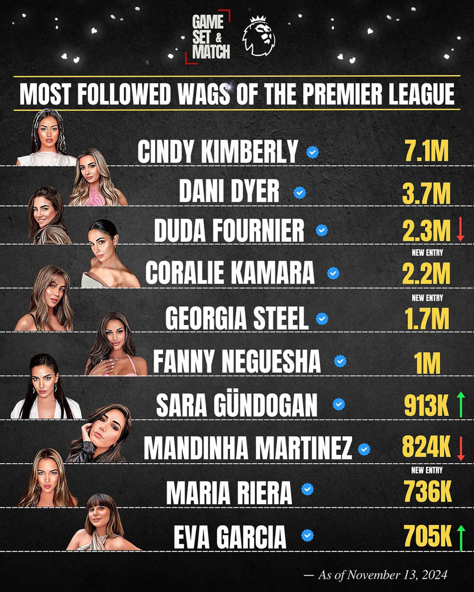Англійський паблік спеціалізується на особистому житті футболістів, а саме спостерігає за іншим боком зірковості гравців. Цього разу GSM зробив добірку із топ-20 дружин футболістів АПЛ (до рейтингу також увійшли і деякі колишні представники чемпіонату) за кількістю підписників у соціальних мережах.