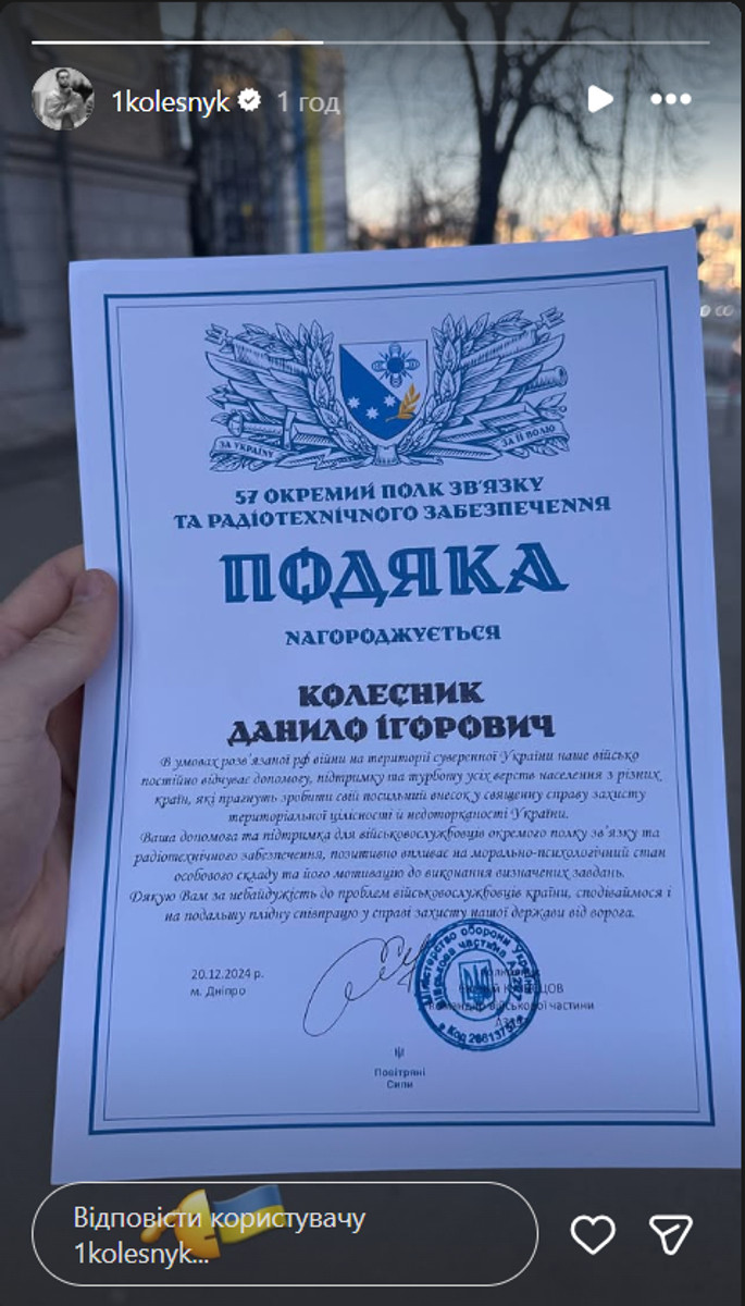 Колишній футболіст Колоса-2 Данило Колесник показав подяку від 57-го окремого полку зв'язку та радіотехнічного забезпечення за 2024 рік.