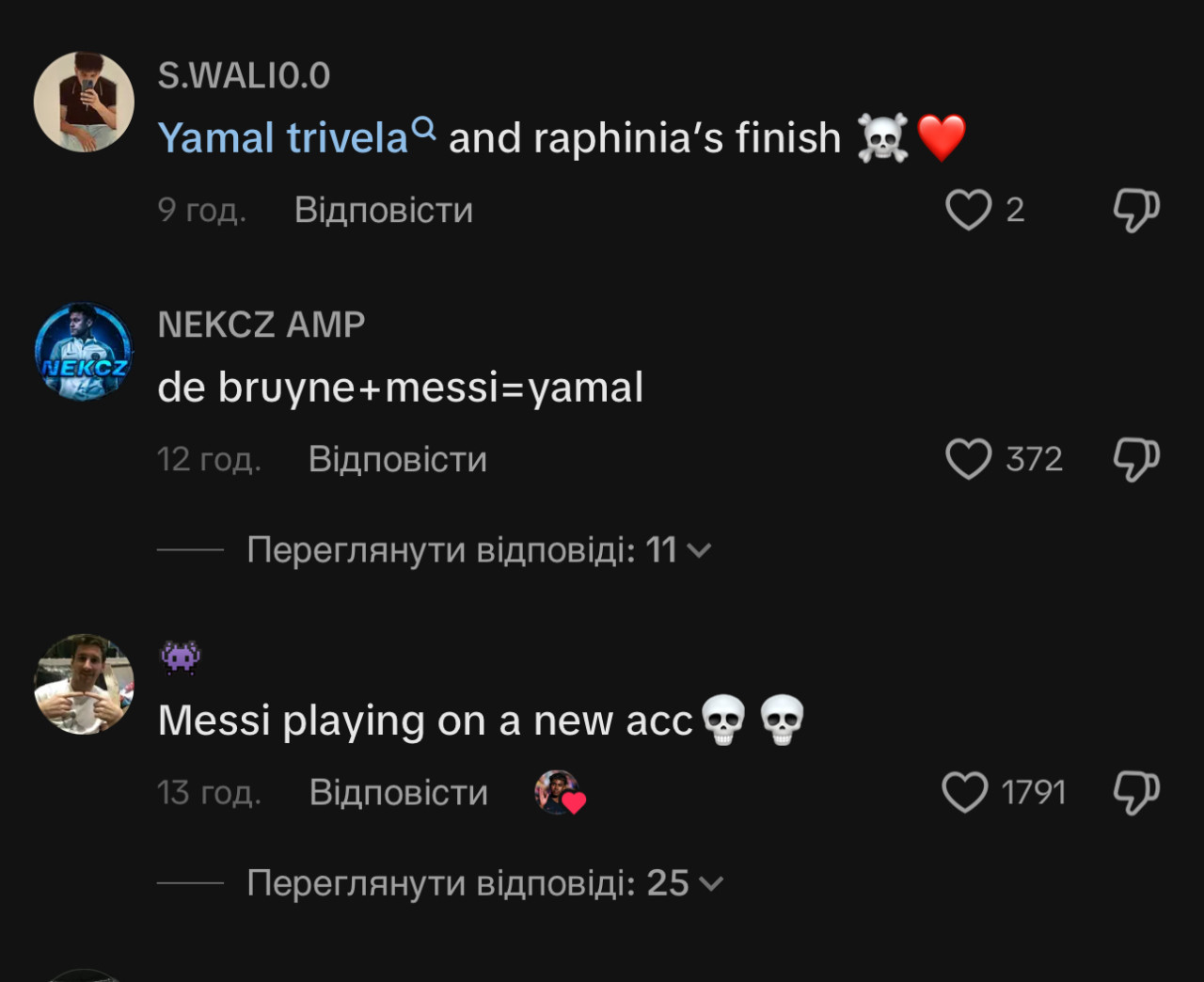 Згодом ця атака потрапила у соцмережі, де активні користувачі та фанати футболу почали божеволіти від навиків Ямаля. Одним із найпоширеніших коментарів був: "Мессі зайшов з нового акаунту".