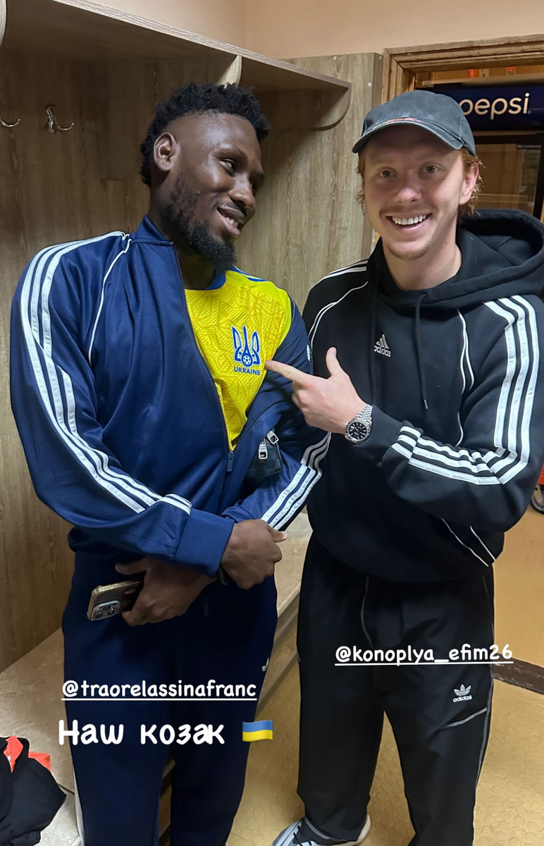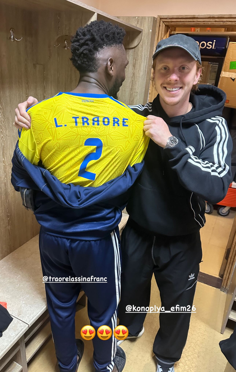 На фото легіонер із Буркіна-Фасо постав у незвичному для себе образі, а саме в іменній футболці збірної України. Поруч із ним опинився Юхим Конопля, що лише додало символізму моменту.