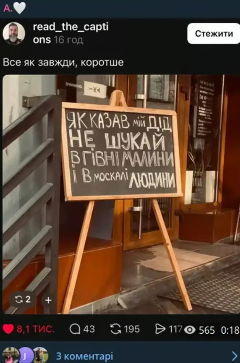 "Моя країна вже чотири роки перебуває у стані війни. Росіяни – агресори, які марно намагаються знищити свободу та незалежність України. Війна триває. У мене немає жодних стосунків з жодним росіянином".