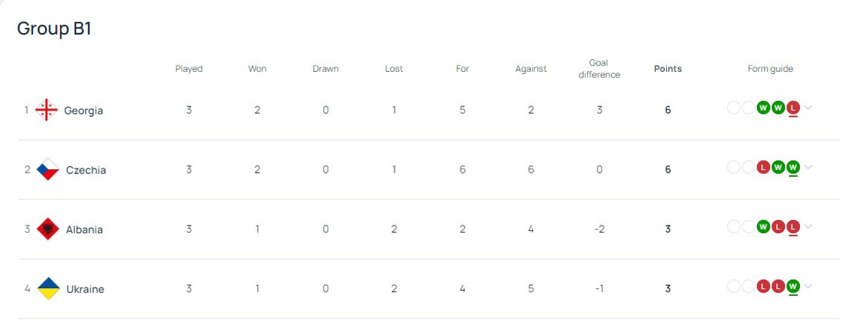 Після трьох турів Україна, попри першу перемогу, залишилася на останній сходинці турнірної таблиці, яку продовжує очолювати збірна Грузії. Албанія також має 3 бали, але йде вище за рахунок перемоги над підопічними Реброва в очній зустрічі.
