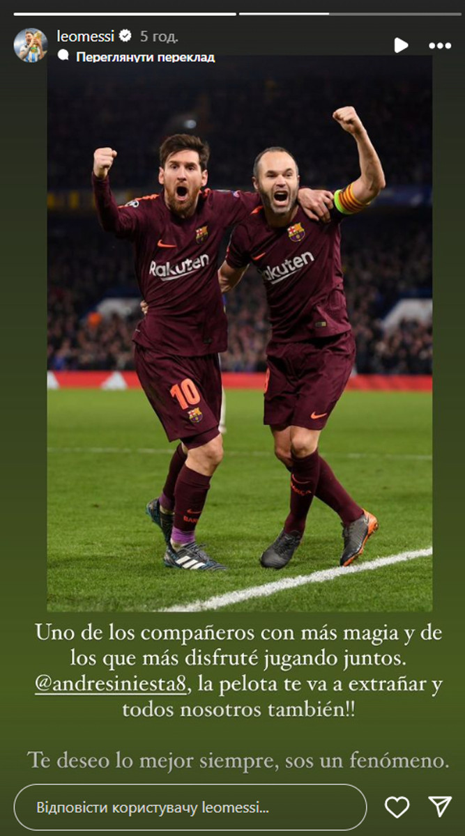 Легенда Барселони Ліонель Мессі, який зараз грає за американський Інтер Маямі, прокоментував рішення свого колишнього одноклубника Андреса Іньєсти завершити кар’єру.