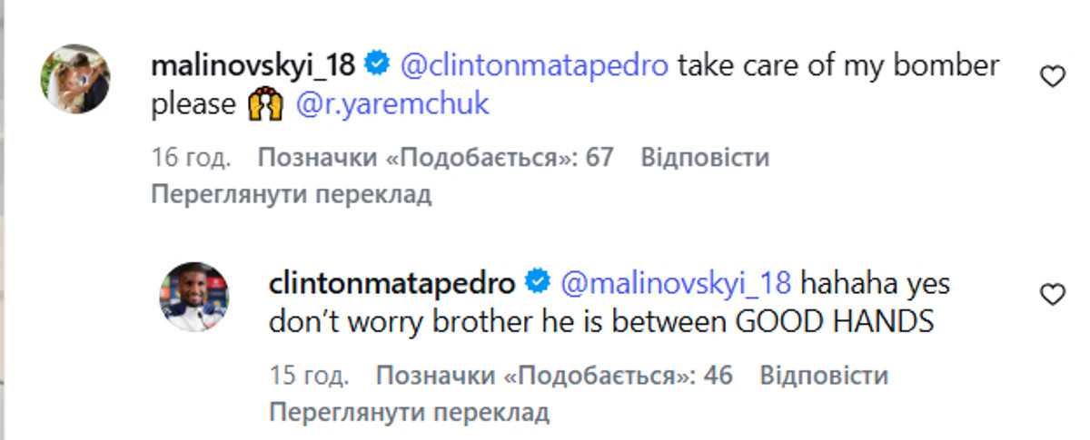 "Клінтоне, подбай про мого бомбардира, будь ласка", – написав у коментарях Малиновський.