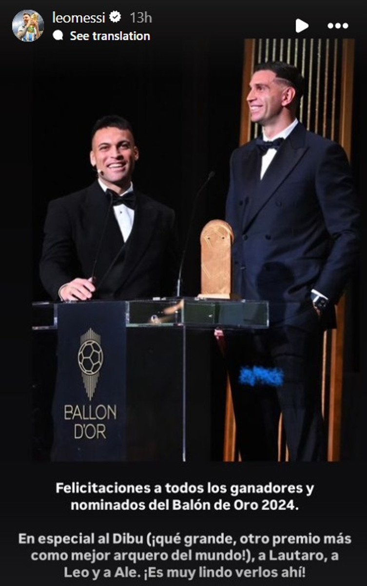 "Вітання всім переможцям і номінантам Золотого м’яча-2024. Особливо "Дібу" (як чудово – ще одна нагорода найкращому воротареві світу!), Лаутаро, Лео і Але. Було дуже приємно бачити вас там", – написав Мессі.