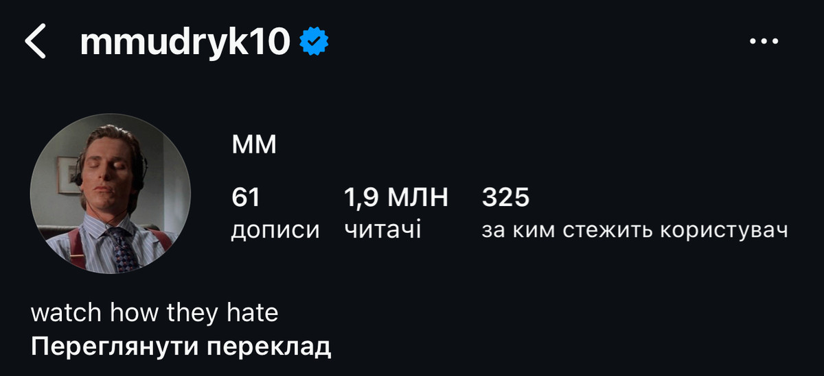 Ще більше запитань викликало нове фото профілю футболіста. Замість власного зображення Михайло обрав кадр із культового фільму "Американський психопат", а саме з Патріком Бейтманом у виконанні Крістіана Бейла. Герой відомий своїм подвійним життям: вдень – успішний бізнесмен, уночі – психопат.