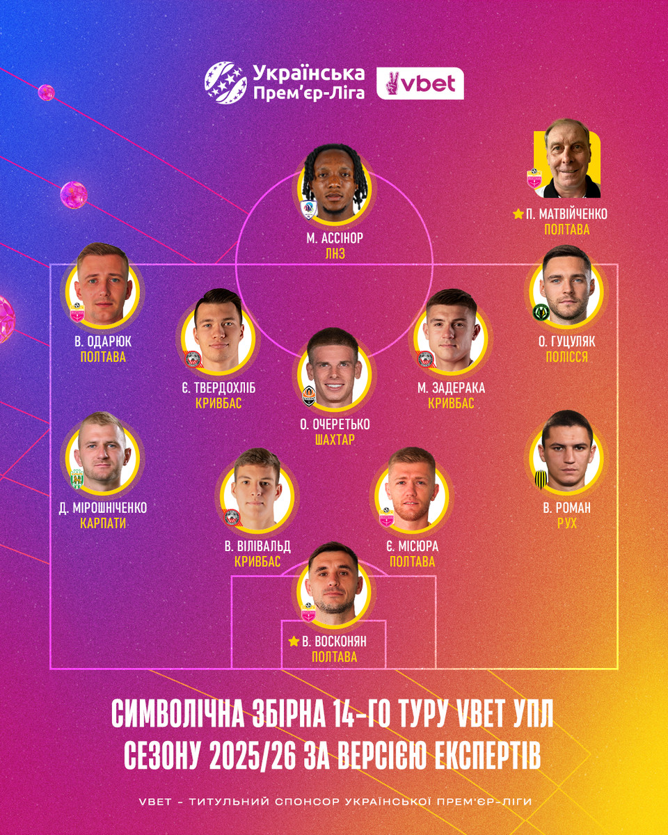 Українська Прем'єр-ліга оголосила найкращого гравця, тренера та символічну збірну 14 туру.