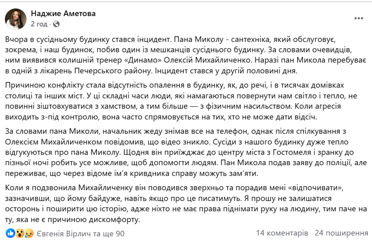"Коли я подзвонила Михайличенку він поводився зверхньо та порадив мені "відпочивати", зазначивши, що йому байдуже, навіть якщо про це писатимуть. Я прошу не залишатися осторонь і поширити цю історію, адже ніхто не має права піднімати руку на людину, тим паче на ту, яка не є причиною дискомфорту", – зазначила Аметова.