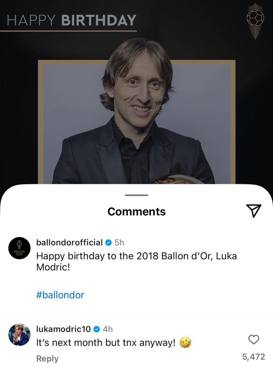 Організатори Золотого м’яча потрапили у незручну ситуацію в соцмережах. В суботу, 9 серпня, вони привітали володаря трофею 2018 року, Луку Модрича, з днем народження. Хоча хорвату виповниться 40 років лише за місяць – 9 вересня.