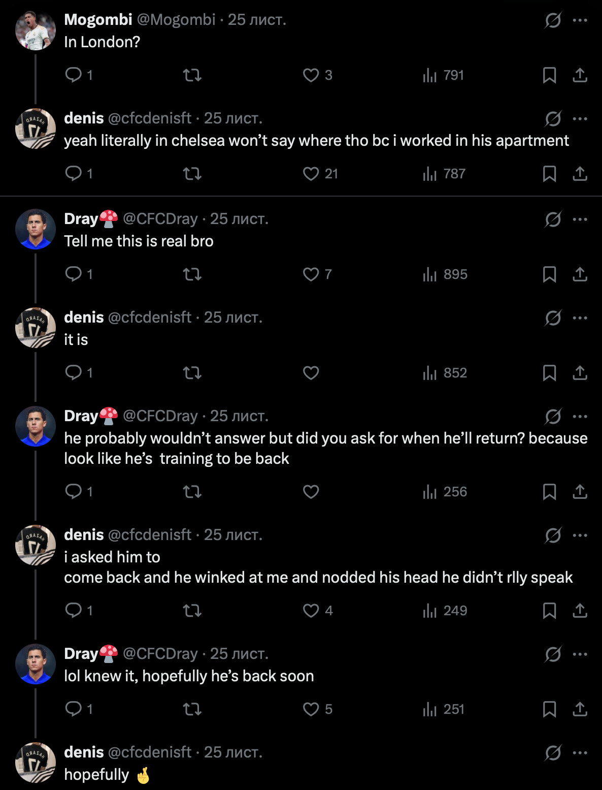 Цей короткий жест одразу запалив фанатську фантазію: можливо, українець справді працює над тим, щоб повернутися на поле й знову допомогти Челсі.
