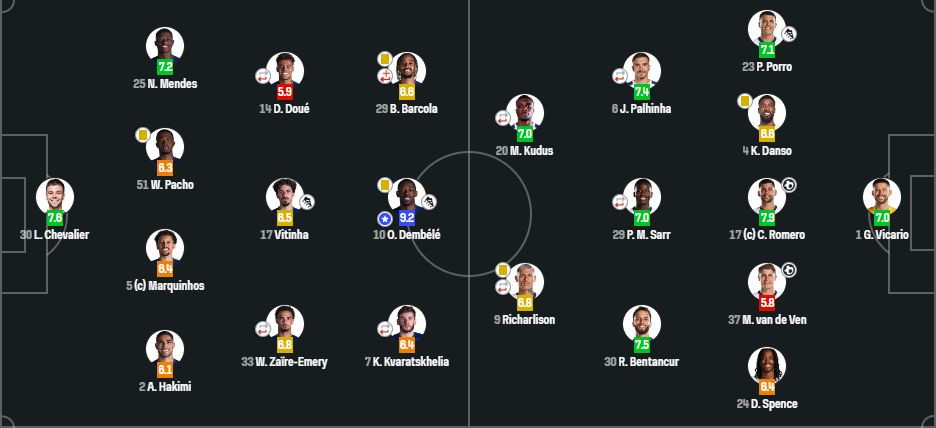 Найкращим гравцем поєдинку за версією статистичного порталу SofaScore став вінгер французького клубу Усман Дембеле, який отримав 9,2.
