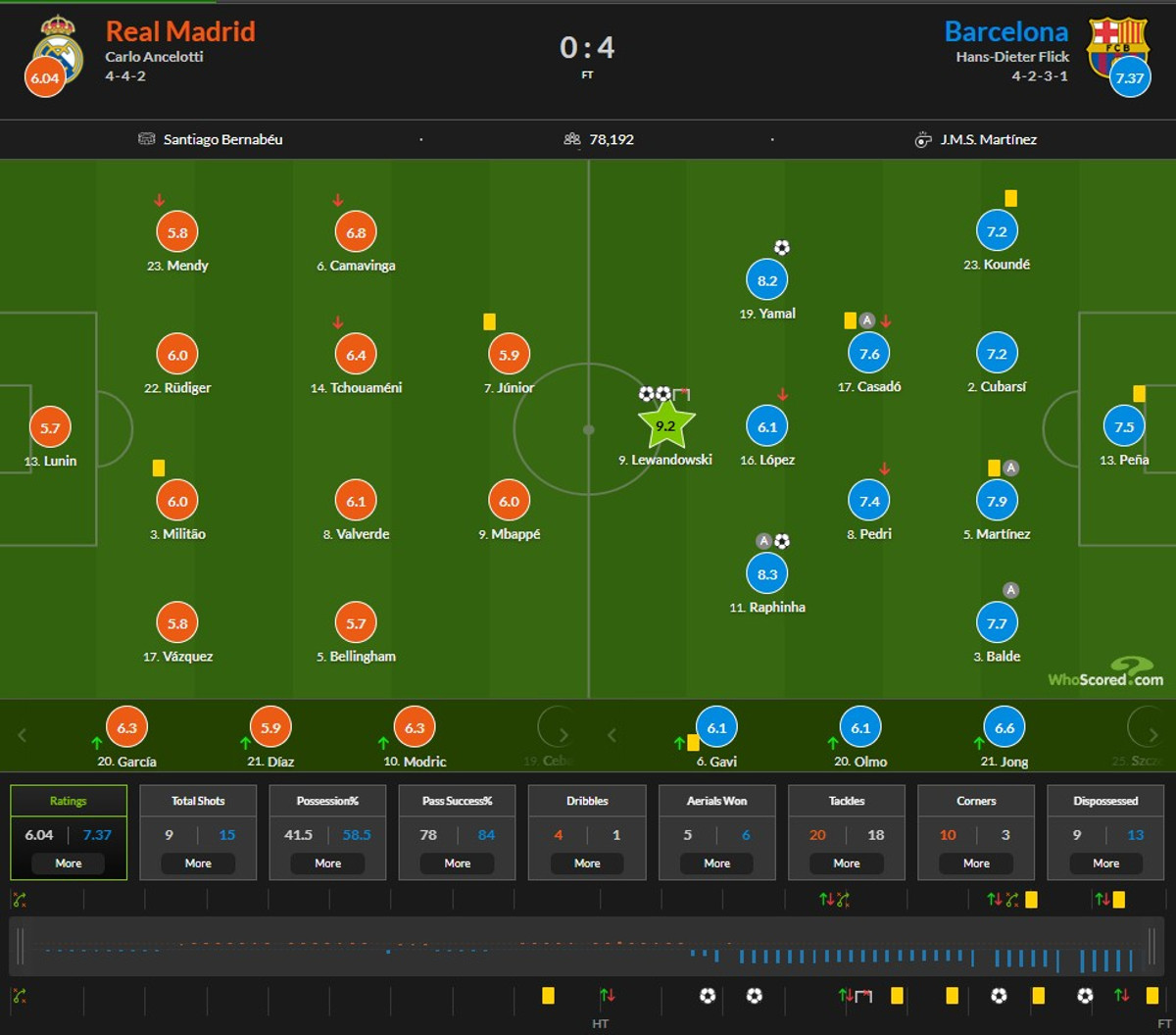 Найвищий бал у матчі отримав польський нападник Барселони Роберт Левандовськи, який став автором дубля. WhoScored поставив йому 9.2 бала.