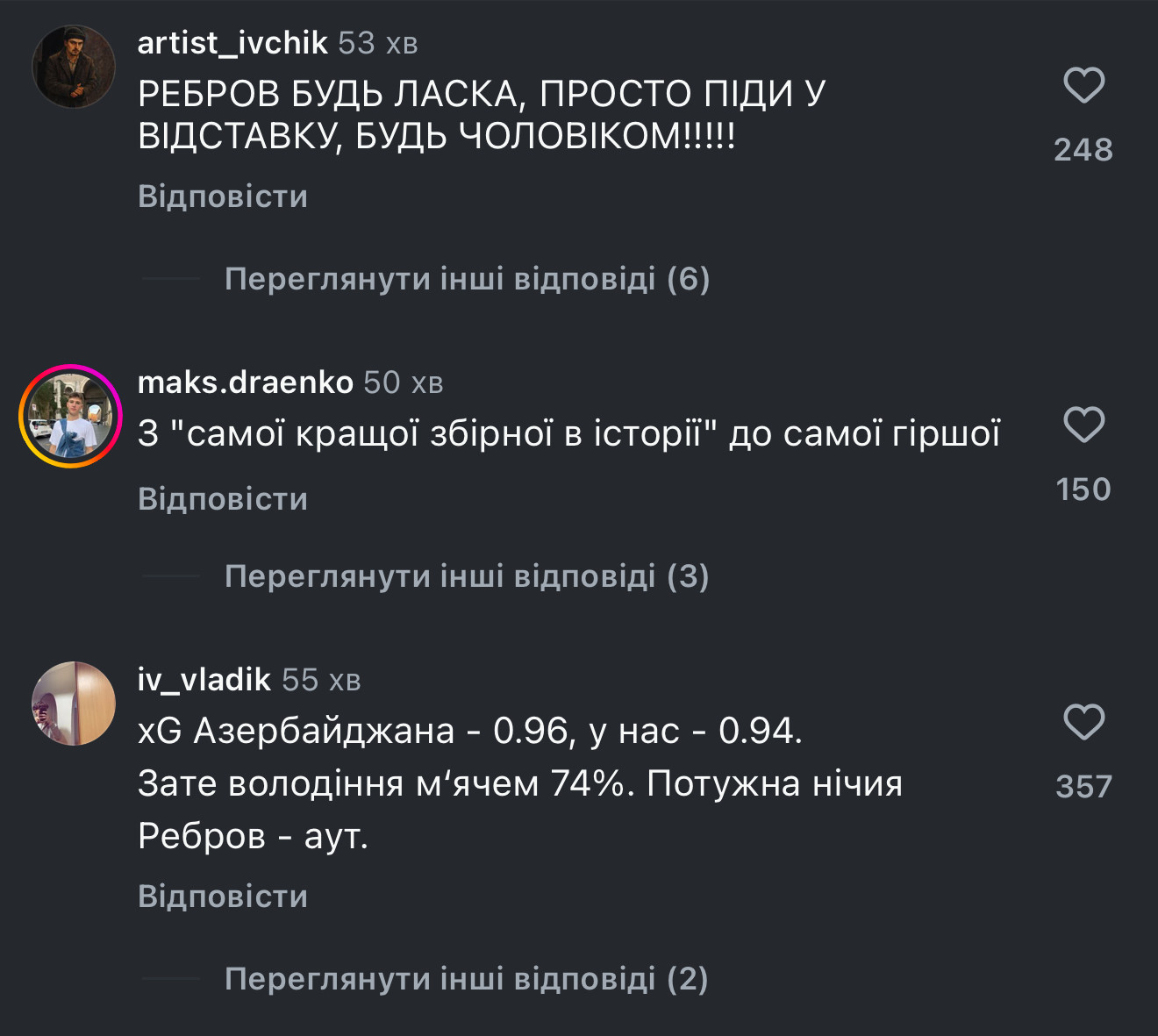 Нічия в Баку стала для України серйозним ударом у боротьбі за вихід із групи, а питання щодо майбутнього Реброва на чолі збірної вже викликає дедалі гарячіші дискусії серед фанатів.