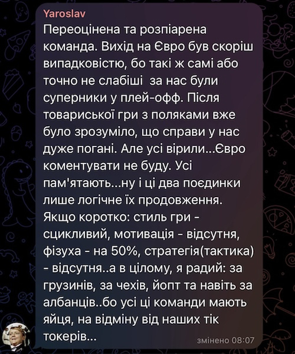 Я не вважаю, що збірна заслужила на таке ставлення. Атака в соцмережах зрозуміла, але віч-на-віч потрібно отримувати відповіді на конкретні, врівноважені запитання, а не демонструвати, які всі "вівці" та "закидати каменями". Від цього результат не зміниться, а ось психологічна яма гарантована. Як з неї вибиратися — не легке завдання для тренерського штабу.