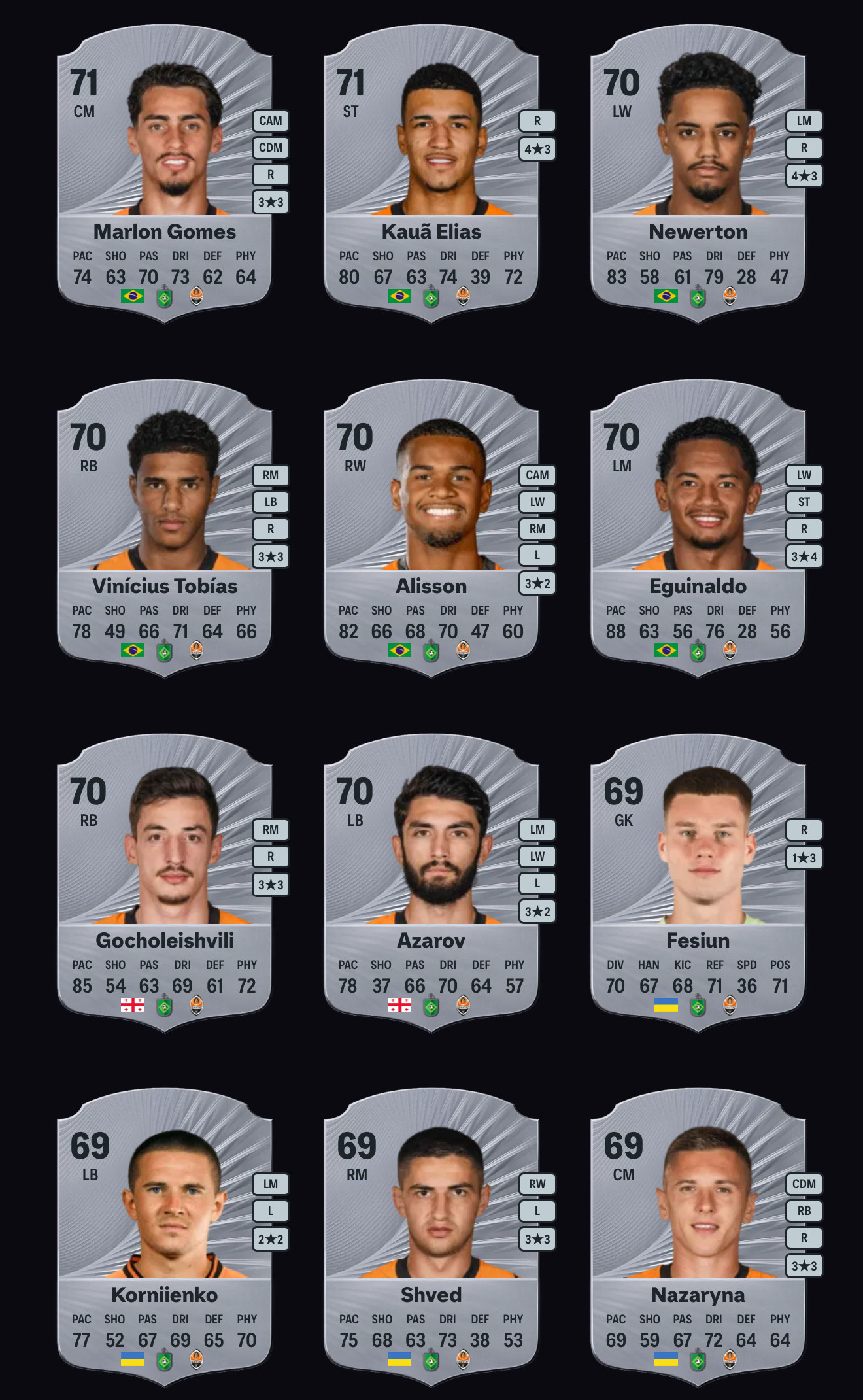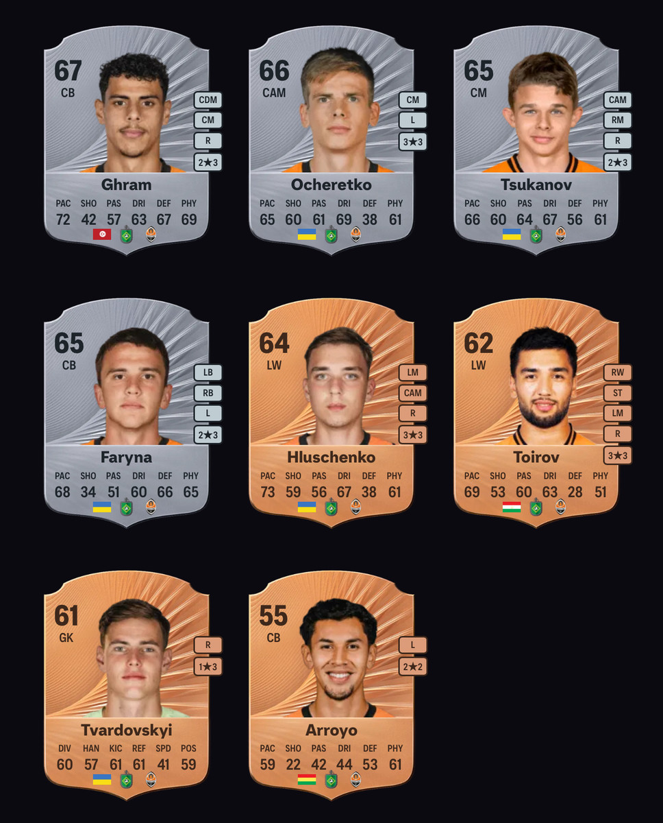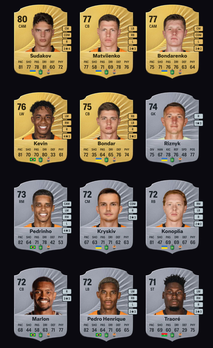 Найвищу оцінку у складі отримав Георгій Судаков – його картка має рейтинг 80. Хоча хавбек вже встиг перебратися до лісабонської Бенфіки, в EA FC він поки залишається частиною Шахтаря.