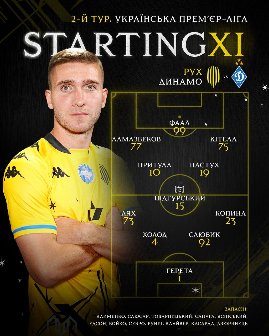 Рух: Герета, Холод, Слюбик, Копина, Лях, Підгурський, Пастух, Притула, Фал, Кітел, Алмазбеков