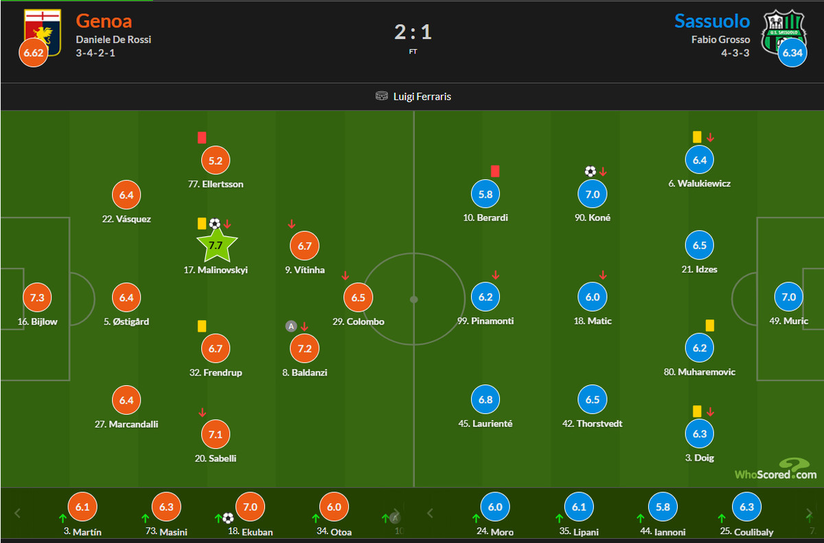 Уродженець Житомира вийшов на поле у стартовому складі та став автором першого голу у ворота Сассуоло на 14-й хвилині. Цей м'яч став 10-м для Малиновського у складі "грифонів".