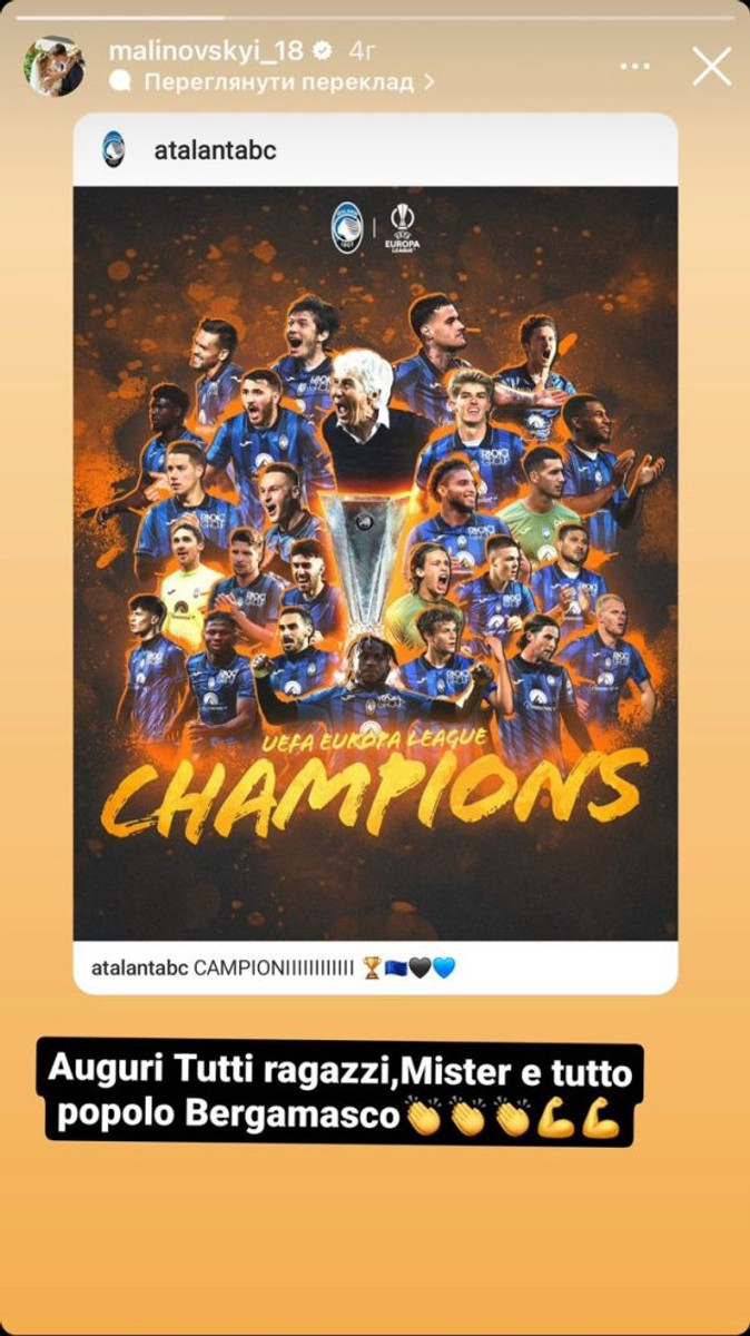 Колишній футболіст Аталанти Руслан Малиновський привітав команду з перемогою у фіналі Ліги Європи над німецьким Баєром.