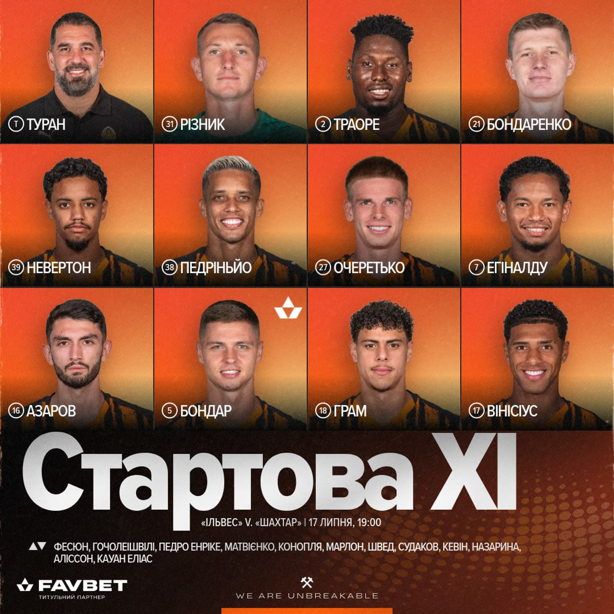 Шахтар: Різник, Азаров, Грам, Бондар, Вінісіус Тобіас, Невертон, Очеретько, Педріньйо, Егіналду, Бондаренко, Траоре