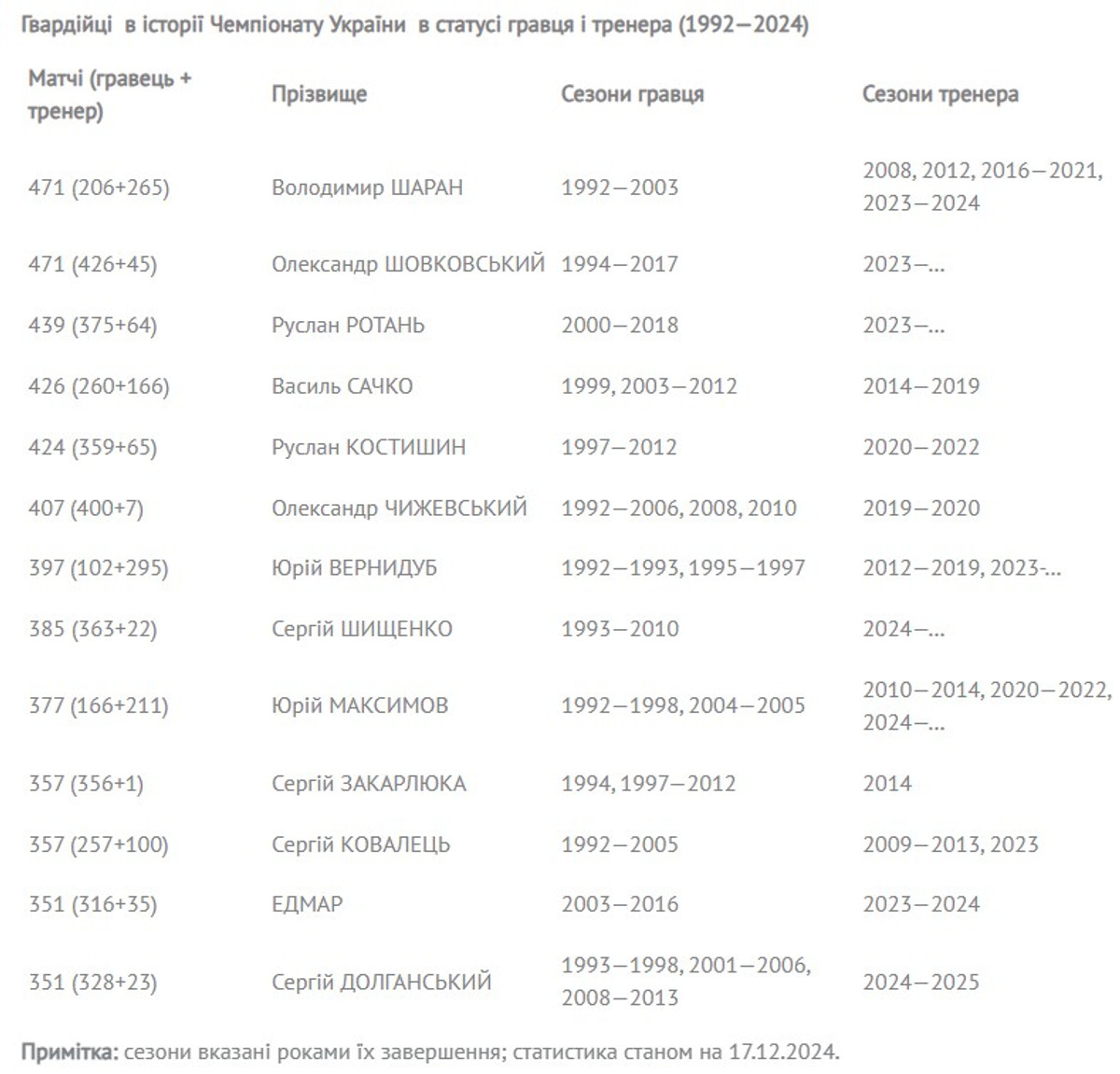 Як пише пресслужба УПЛ, за цим показником Шовковський повторив рекорд Володимира Шарана, в активі якого 265 матчів на тренерському містку та 206 ігор в статусі гравця різних клубів УПЛ.