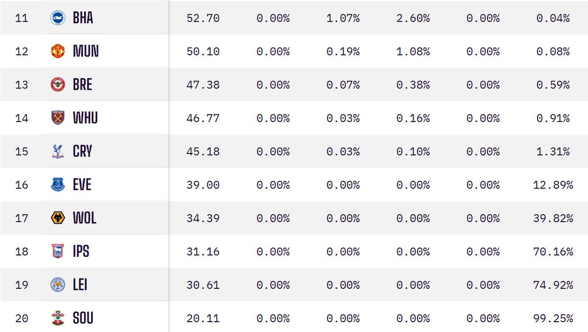 Штучний інтелект не дуже оригінальний у прогнозі аутсайдерів сезону і вважає, що 18, 19 та 20 місця посядуть команди, що і зараз їх обіймають, тобто Іпсвіч, Лестер та Саутгемптон. Ймовірність вильоту "святих" складає 99,25%. До цієї трійки в боротьбу за виживання ще можна записати Вулвергемптон, у якого 39,82% шансу покинути АПЛ після завершення сезону.