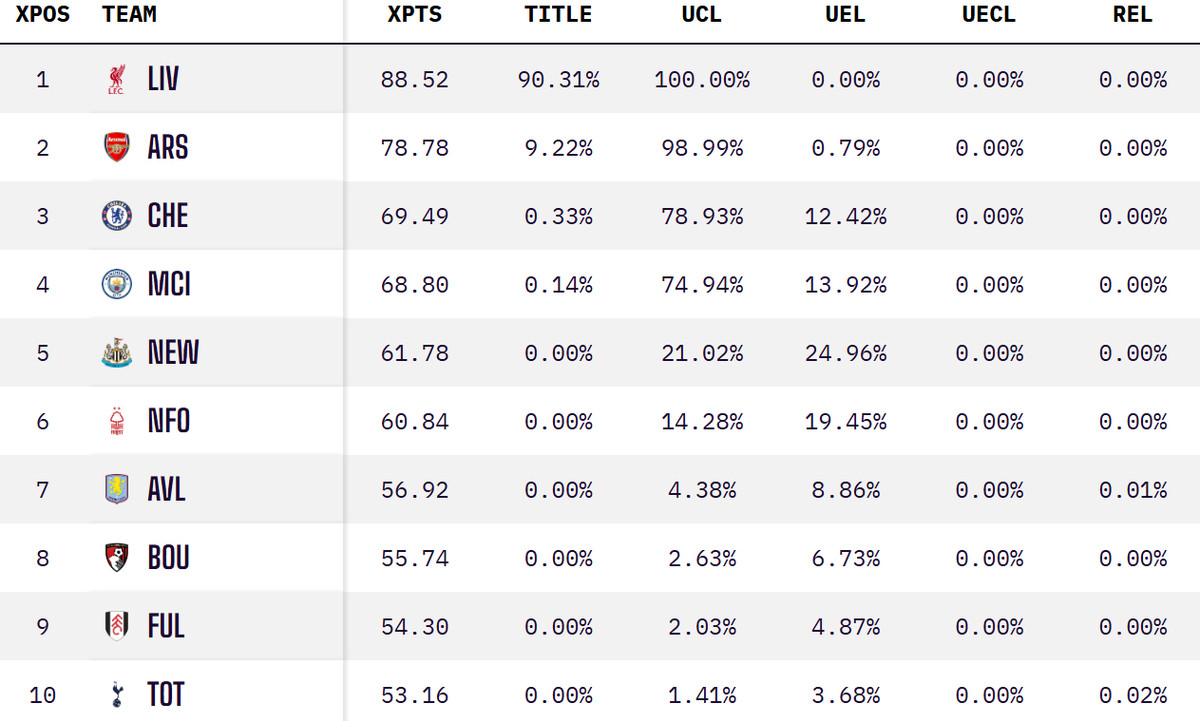 Прогнозована таблиця АПЛ в кінці сезону-2024/2025 за версією Opta Analyst:
