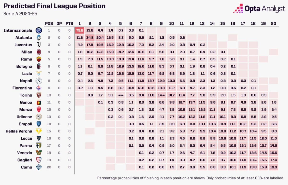 Інтернаціонале залишається головним претендентом на виграш Серії А. За прогнозом штучного інтелекту "нерадзуррі" мають 79,2% шансу на здобуття трофея. Другою силою в Італії, на думку Opta, стане Аталанта, яка минулого сезону виграла Лігу Європи. Їх шанс на виграш Скудетто складає 11,2%. Найтитулованіша італійська команда, Ювентус, має всього 4,2% на перше місце турнірної таблиці.