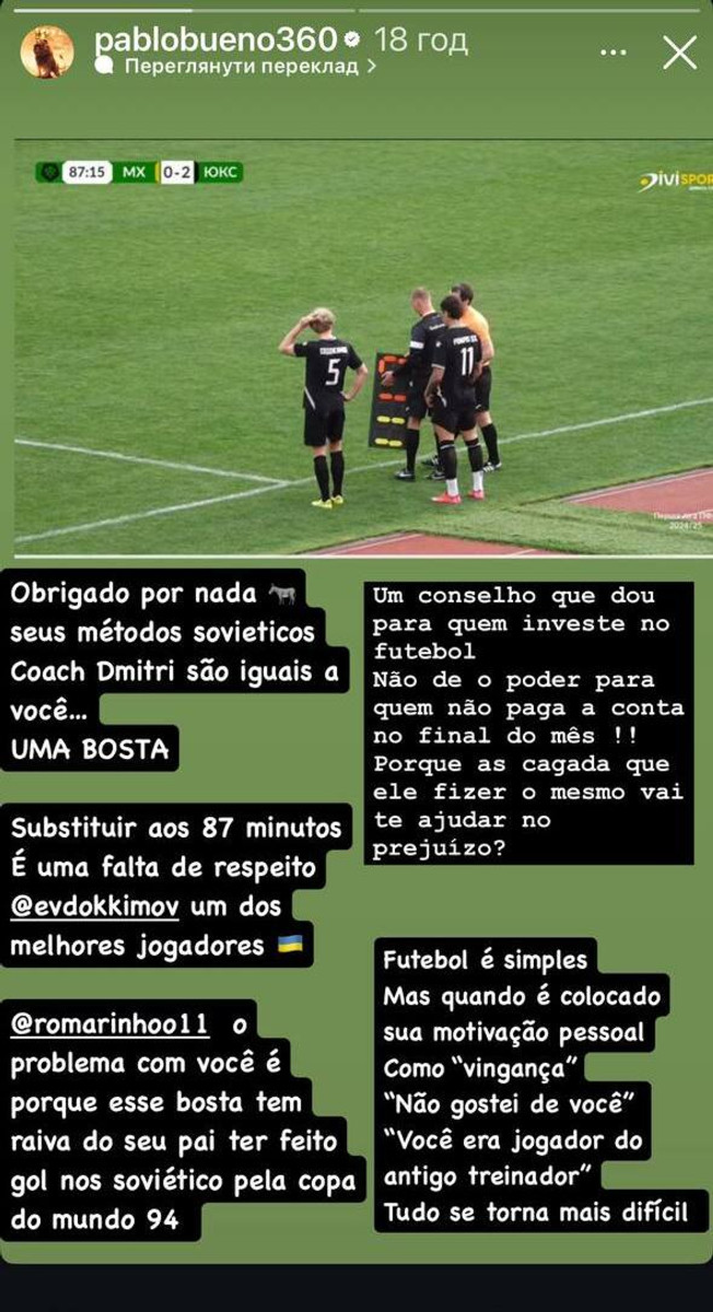 "Дякую ні за що! Одна порада, яку я даю: твої радянські методи для тих, хто інвестує у футбол, тренере Дмитро та подібні, – приклад того, що не варто давати владу тим, хто не платить рахунки в кінці місяця! Це лайно! Бо коли він наробить дурниць і зробить заміни на 87 хвилині – хіба це допоможе тобі відшкодувати збитки?" – зазначив Буено у сторіс.