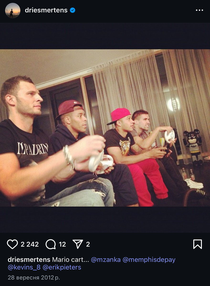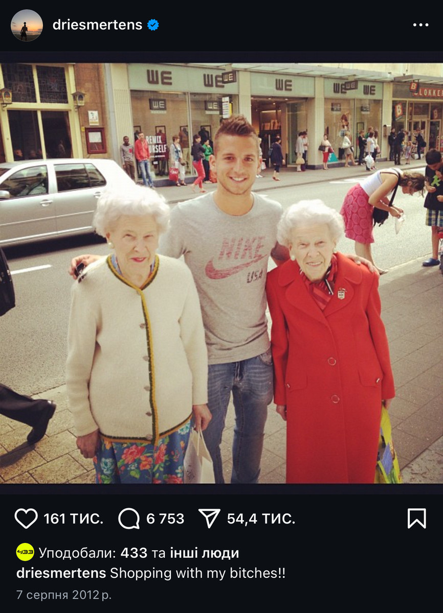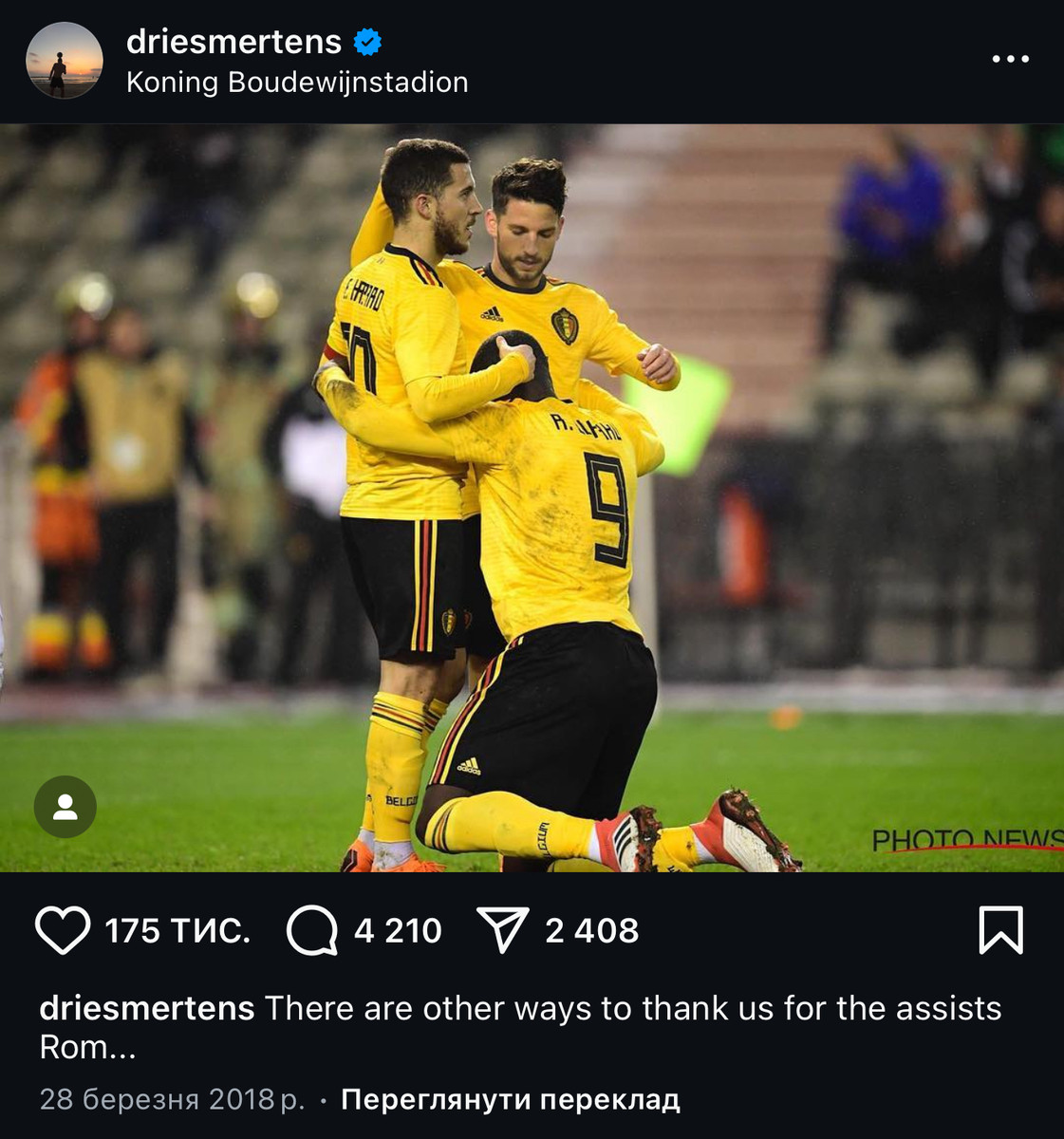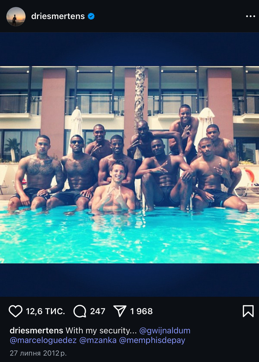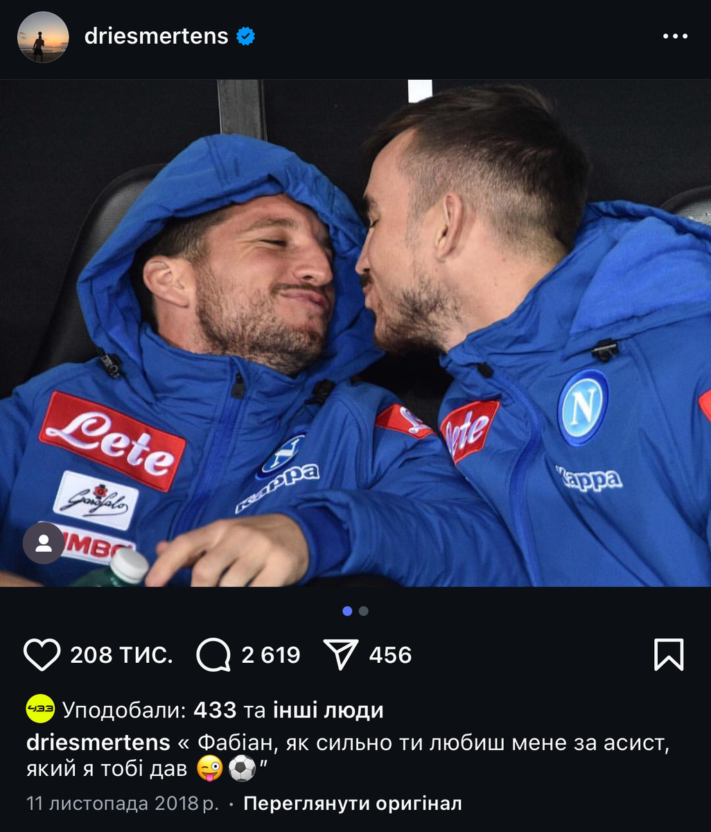 Не забував Мертенс і тролити своїй одноклубників. Якось нападник виставив фото з Лукаку, який стоїть перед ним на колінах біля паху, а також запостив знімок "поцілунку" з Фабіаном Руїсом. І все це він назвав "подякою за асисти".