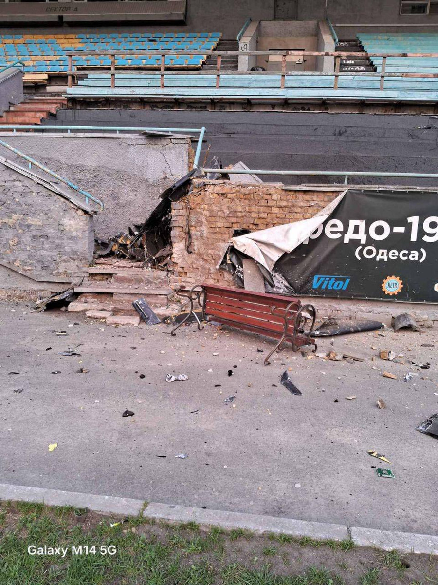 На фото видно пошкодження спортивного об'єкта, які, ймовірно, були спричинені атакою ударних безпілотників. Уламки дронів валяються неподалік трибун, є пошкодження і бігових доріжок та адмінбудівель