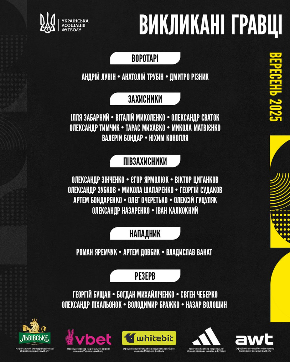 Головний тренер збірної України Сергій Ребров разом зі своїм штабом визначився зі складом команди на майбутні матчі відбору чемпіонату світу 2027 року проти Франції та Азербайджану.