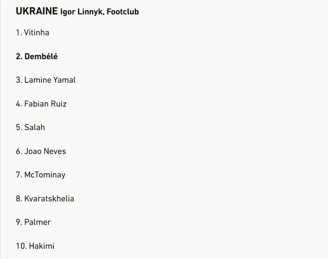 Друге місце від України отримав переможець нагороди Усман Дембеле, а третю сходинку посів вінгер Барселони та збірної Іспанії Ламін Ямал.