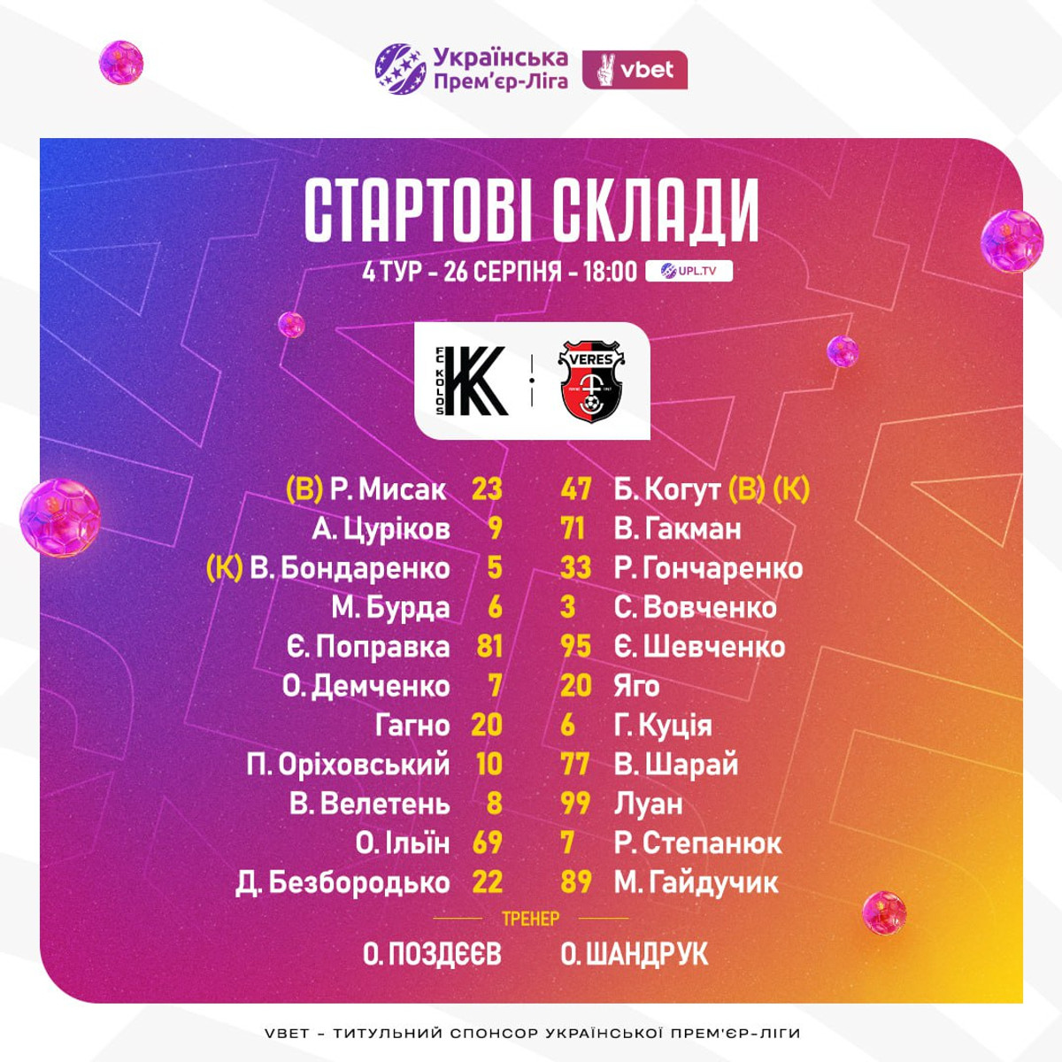 Офіційний сайт Української Прем’єр-ліги оприлюднив стартові склади Колоса та Вереса на матч 4 туру чемпіонату України-2024/25.