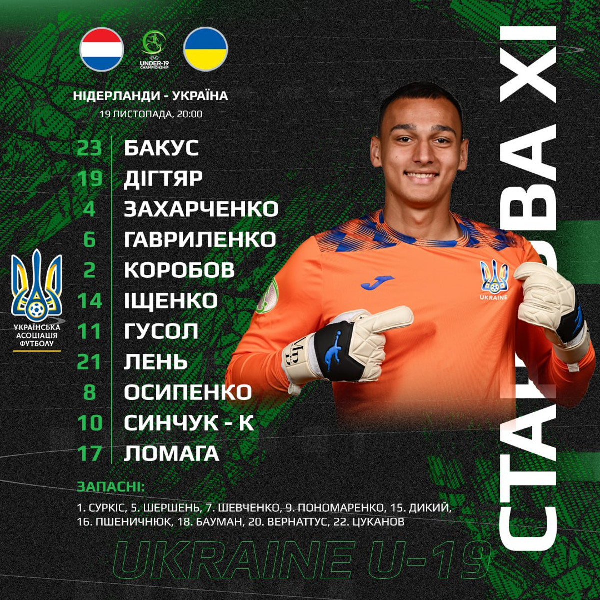 Україна U-19: Бакус – Дігтяр, Захарченко, Гавриленко, Коробов – Іщенко, Гусол, Лень, Осипенко, Синчук – Ломага.