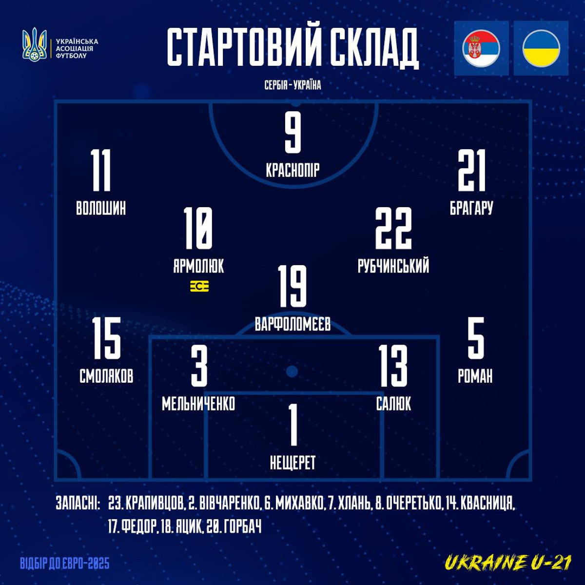 Україна: Нещерет, Роман, Салюк, Мельниченко, Смоляков, Варфоломеєв, Ярмолюк, Рубчинський, Брагару, Краснопір, Волошин