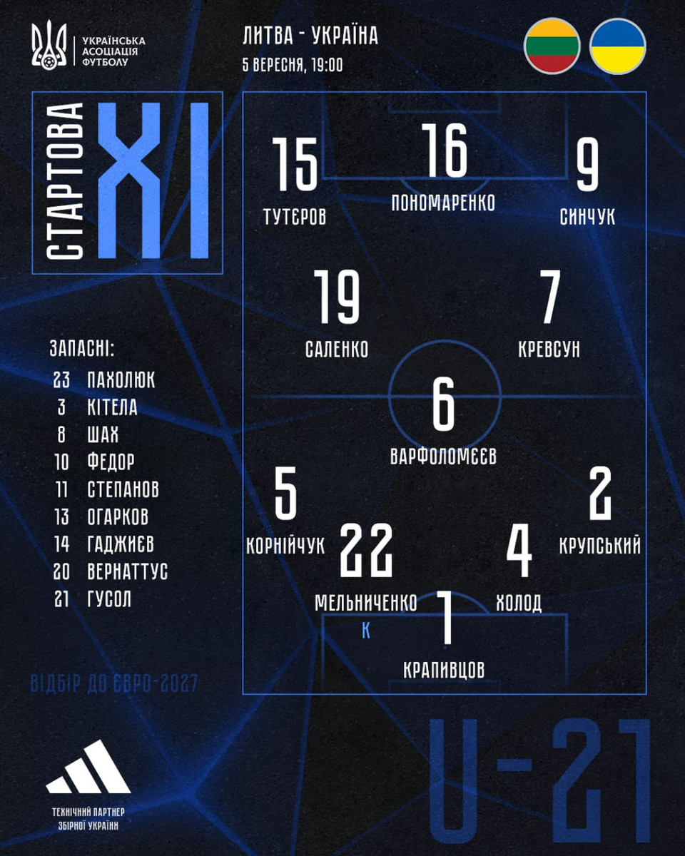 Тренерський штаб Молодіжної збірної України U-21 на чолі з головним тренером Унаї Мельгосою визначився зі стартовим складом на матч проти Литви в межах стартового матчу відбіркового етапу на чемпіонат Європи-2027.