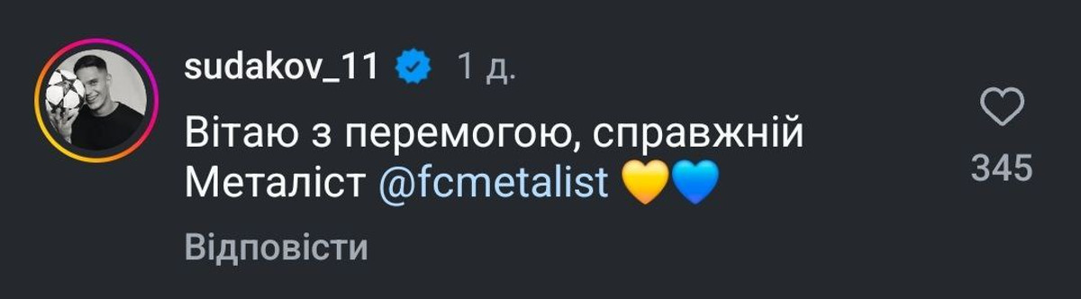 Пресслужба Металіста 1925 після завершення матчу опублікувала пост у соцмережах із результатом поєдинку. У коментарях Судаков написав "Вітаю з перемогою, справжній Металіст".
