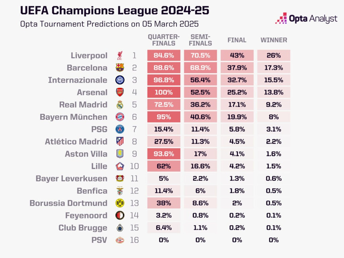На першому місці перебуває англійський Ліверпуль, чиї шанси на успіх оцінюються у 26%. Далі йде іспанська Барселона (17,3%) та міланський Інтер (15,5%).